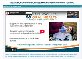 Last August, Oral Health Kansas (OHK) began a series of free webinars titled “New Era, New Opportunities” Making Medicaid Work for You”. The first session, New Rates, Better Coverage, shared information about the KanCare (Medicaid) program and the improvements in services in the Medicaid program and the increases in dental rates as well as how OHK can help providers with their questions regarding Medicaid and how to become a Medicaid provider. The webinar is only 30 minutes, so check it out!